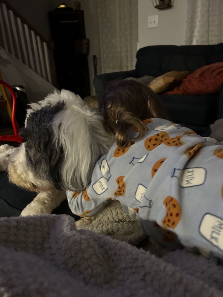 One moment that solidified Dewey’s bond with Lottie happened when she was just five months old and seriously ill with COVID and two other viruses. After a scary ER visit, we struggled at home with her breathing. Dewey seemed to sense something was wrong. Breaking the rules, he jumped on the couch and curled protectively around Lottie and Mea while she slept. Lottie rested her head on Dewey’s belly, and her breathing improved almost immediately. It was a moment of deep connection and comfort we'll never forget.